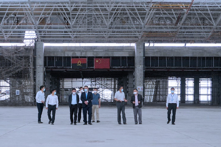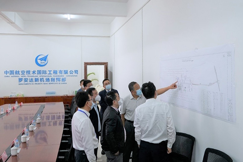 On the morning of July 25, local time, Chinese Ambassador to Angola Tao Gong, Economic and Commercial Counselor Yuzhong Lu, Police Counselor Guangming Li and other delegation visited the Project Commanding Office of Luanda,Angola New International Airport of our company,AVIC-KDN to inspect and guide the work. Project headquarters commander Jun Cheng, deputy commander Dexiang Liu, Bin Cao and related personnel accompanied.